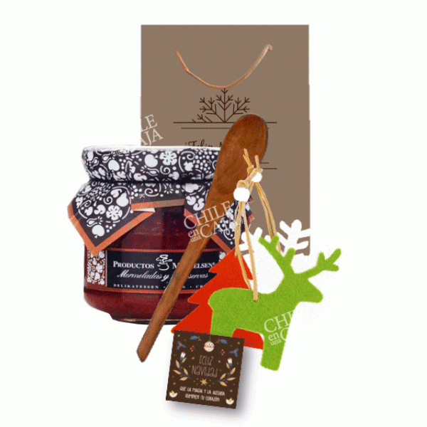 Rica mermelada dulce Mickelsen (250 grs.) diferentes variedades con cuchara de madera fabricados por artesanos de la región de la Araucanía. Y para que sea más entretenido tres adornos navideños de fieltro para colgar: copo de nieve, árbol de navidad y reno , medidas 9 cm aprox.