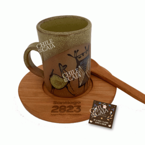 Set de una taza de gres para café, acompañado de platillo y cuchara de madera realizadas por artesanos de la región de la Araucanía. Consultar por diseños y colores disponibles para la taza de café.
