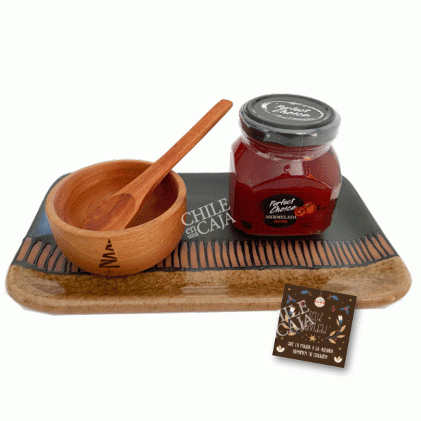Con pocillo de madera (3”) y cuchara de madera nativa madera + acompañamiento salado de 160 grs. Alternativas: mermelada pimentón piquillo, mermelada de rocoto o mermelada de cebolla morada..